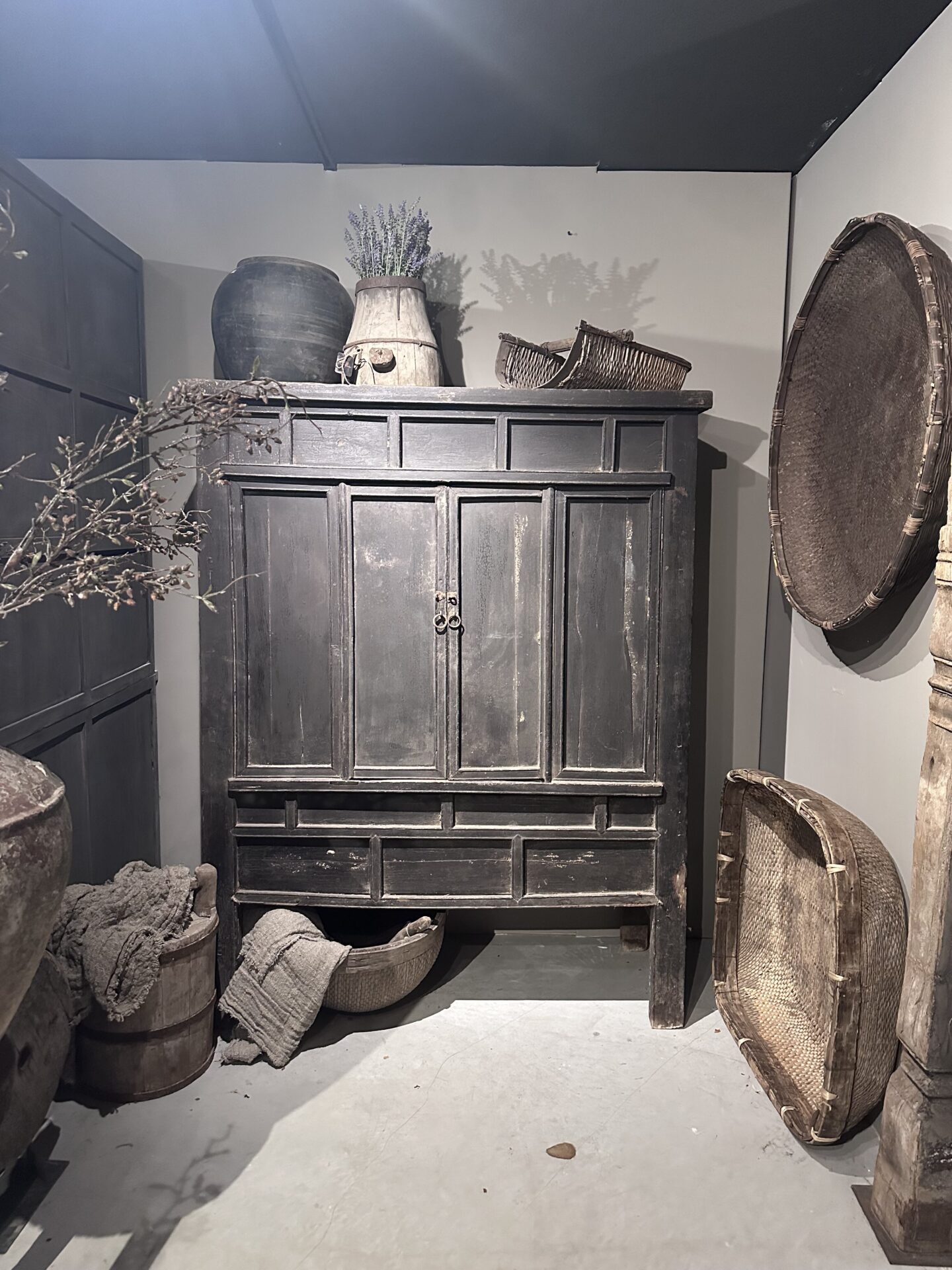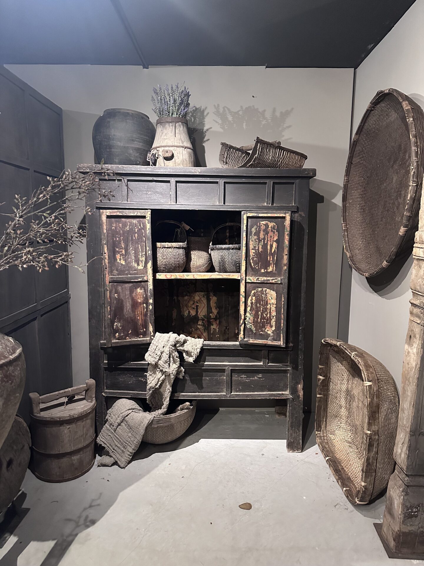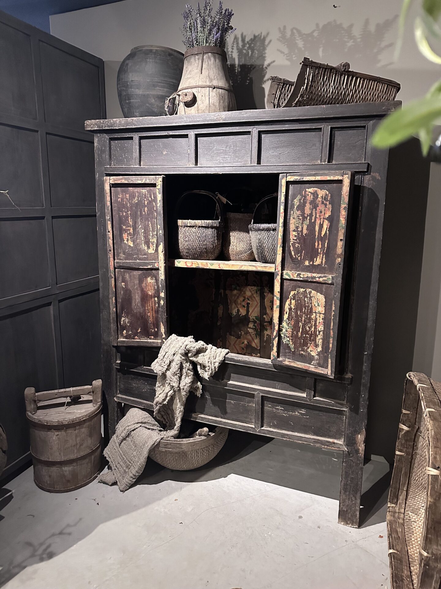Deze authentieke antieke Chinese kast (176cm hoog) draagt zijn verleden met trots. De doorleefde zwarte lak en de zichtbare sporen van decennialang gebruik vertellen een verhaal dat geen enkel nieuw meubel kan imiteren. Met zijn robuuste uitstraling en unieke details—zoals de originele panelen en de prachtige binnenzijde—brengt deze kast direct een warme, verstilde sfeer in je interieur.
