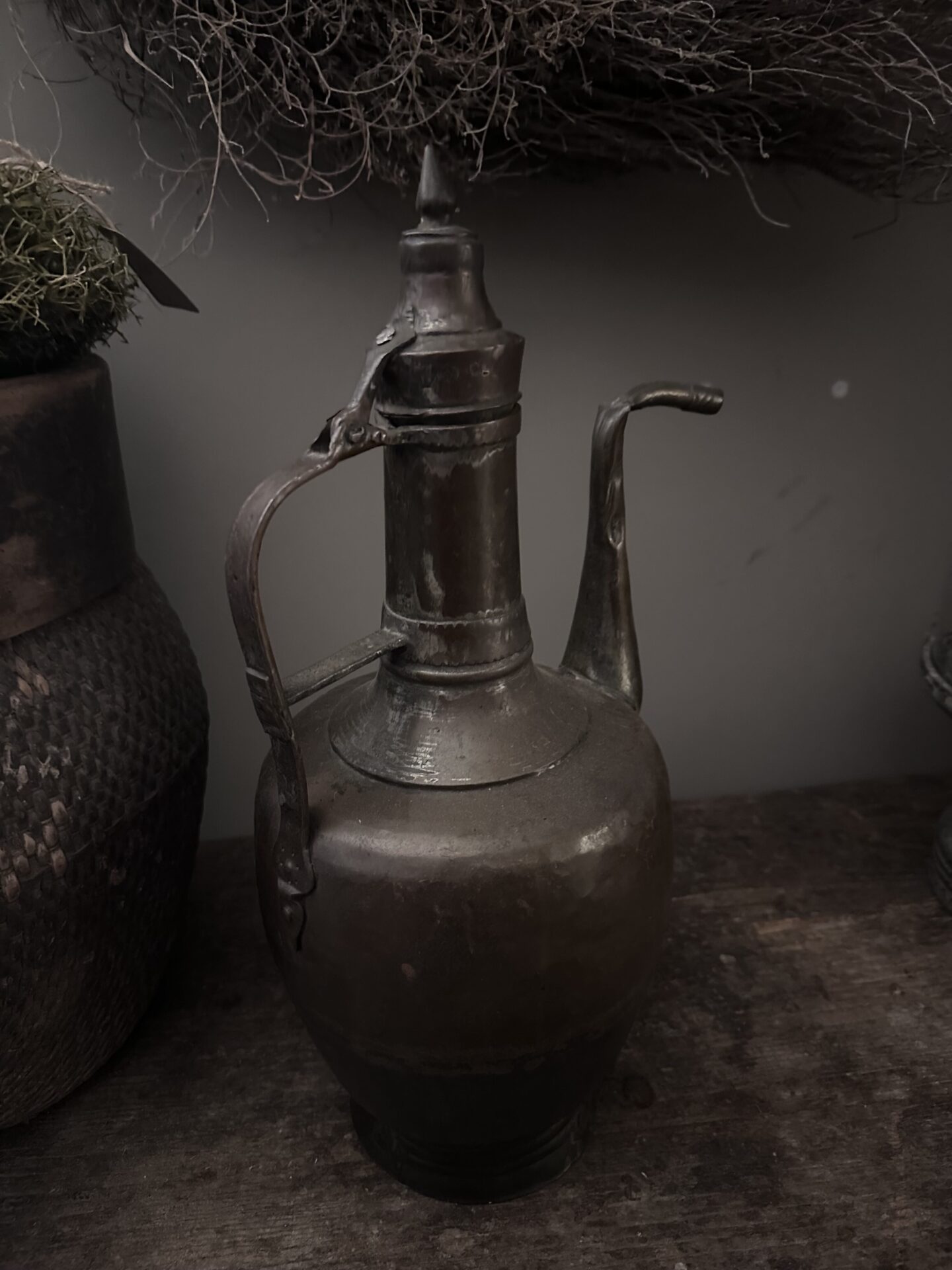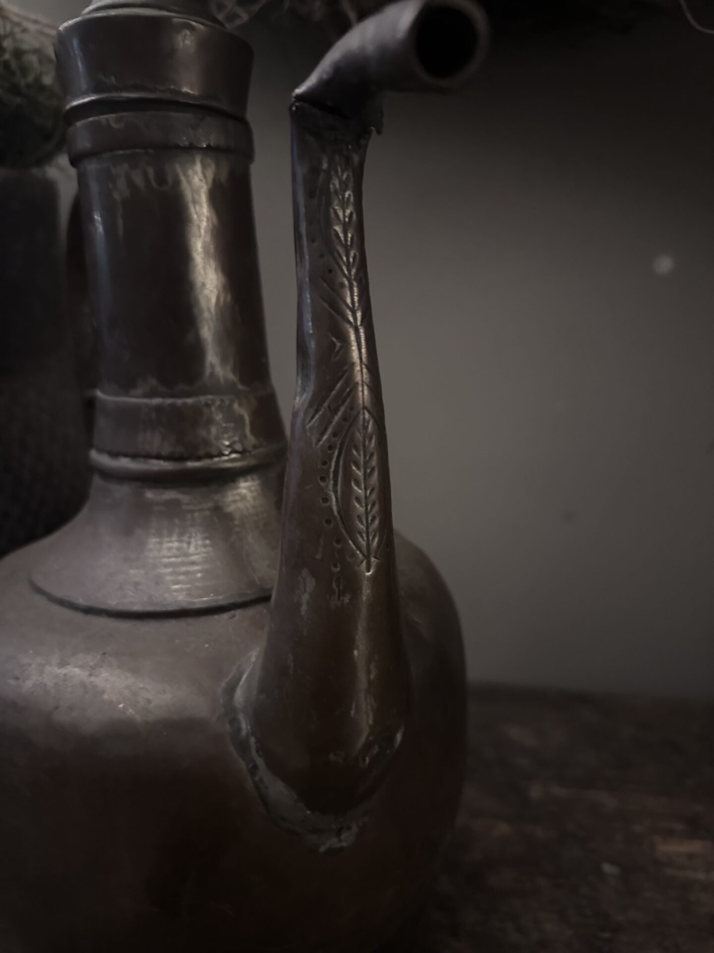• Gedetailleerd graveerwerk: De tuit is voorzien van verfijnde, handgekerfde motieven (blad- en lijnelementen), wat duidt op een ambachtelijke herkomst uit het Midden-Oosten of de Balkan.