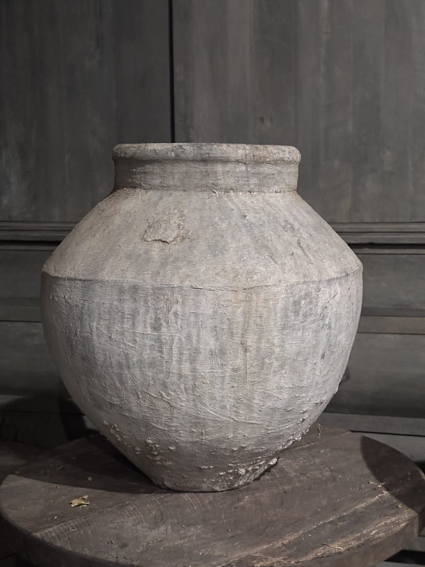 Deze robuuste kruik vertelt een verhaal. De ruwe, grijze afwerking en de zichtbare gebruikssporen geven het object een onmiskenbaar authentiek karakter. Geen enkele kruik is hetzelfde, wat betekent dat je met dit exemplaar een echt one-of-a-kind item in huis haalt.