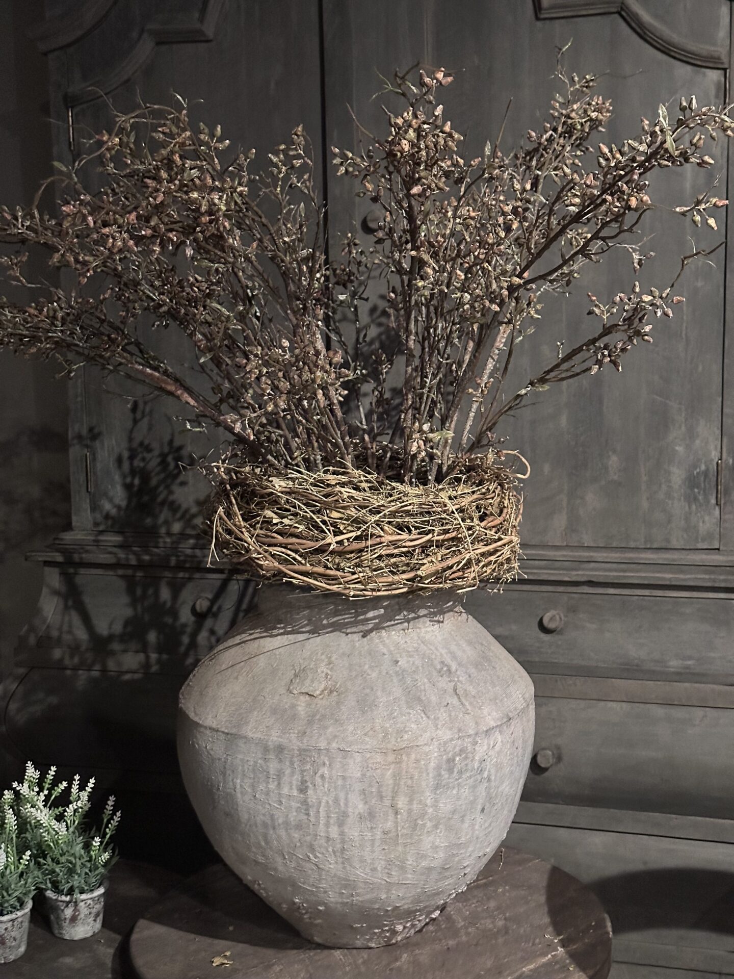 Dankzij de brede opening is deze stenen pot bij uitstek geschikt voor een grote bos droogbloemen, takken of een weelderige Asparagus. Of je hem nu op een houten sidetable plaatst of als solitair object op de grond, deze waterkruik creëert direct een serene en warme sfeer.