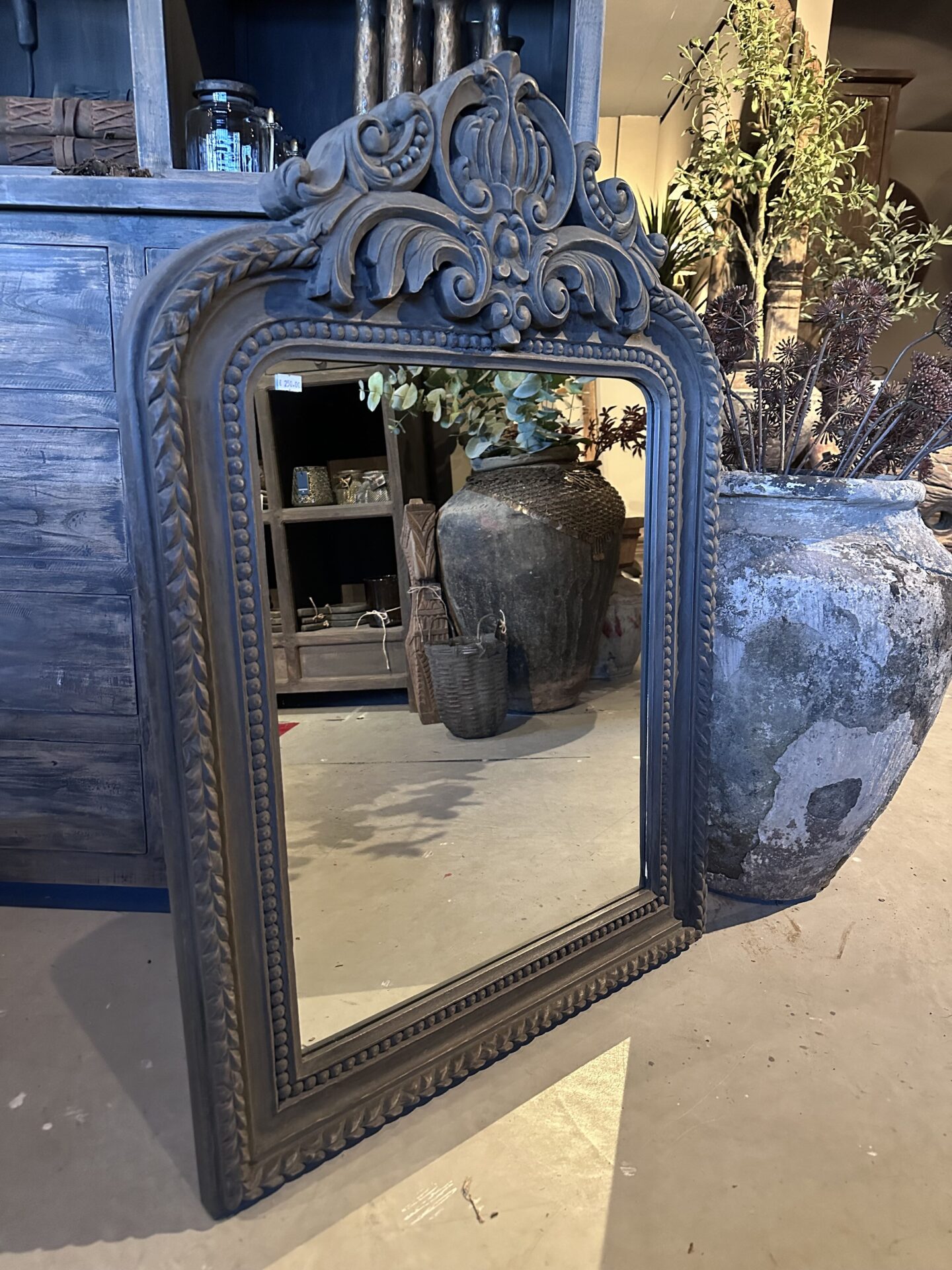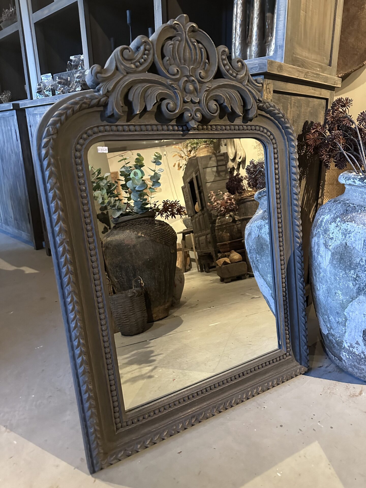 De spiegel onderscheidt zich door de opvallende ornamenten aan de bovenzijde en de gedetailleerde afwerking van de lijst. De antiek grijze finish geeft de spiegel een doorleefde, authentieke look die perfect past in een landelijk interieur, een sober chic decor of een klassieke hal.
