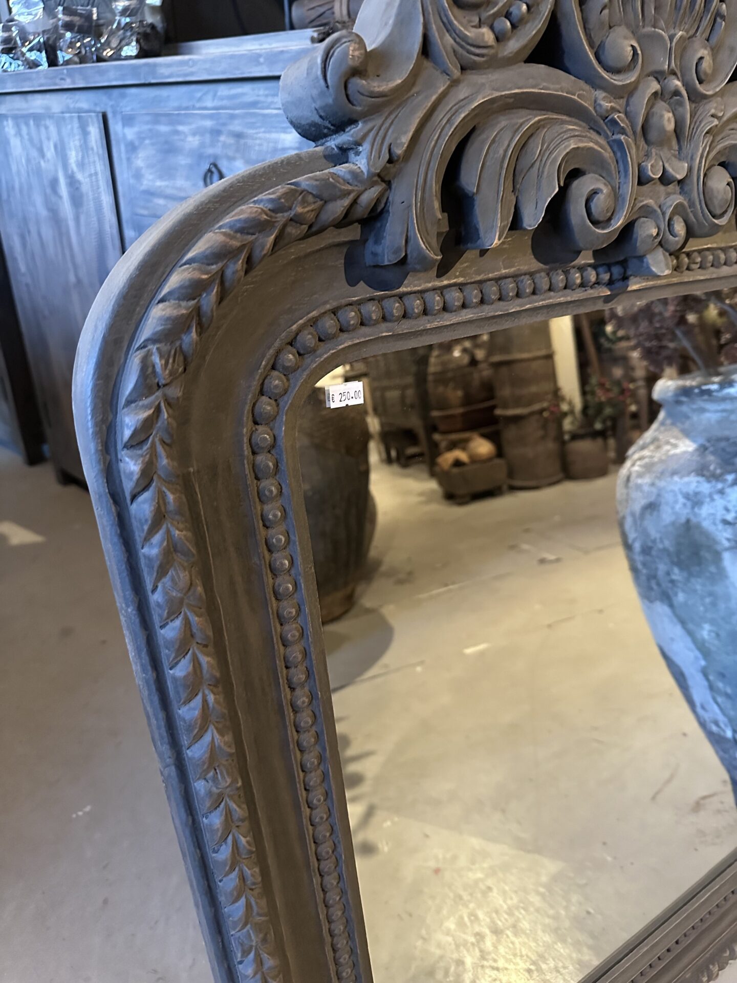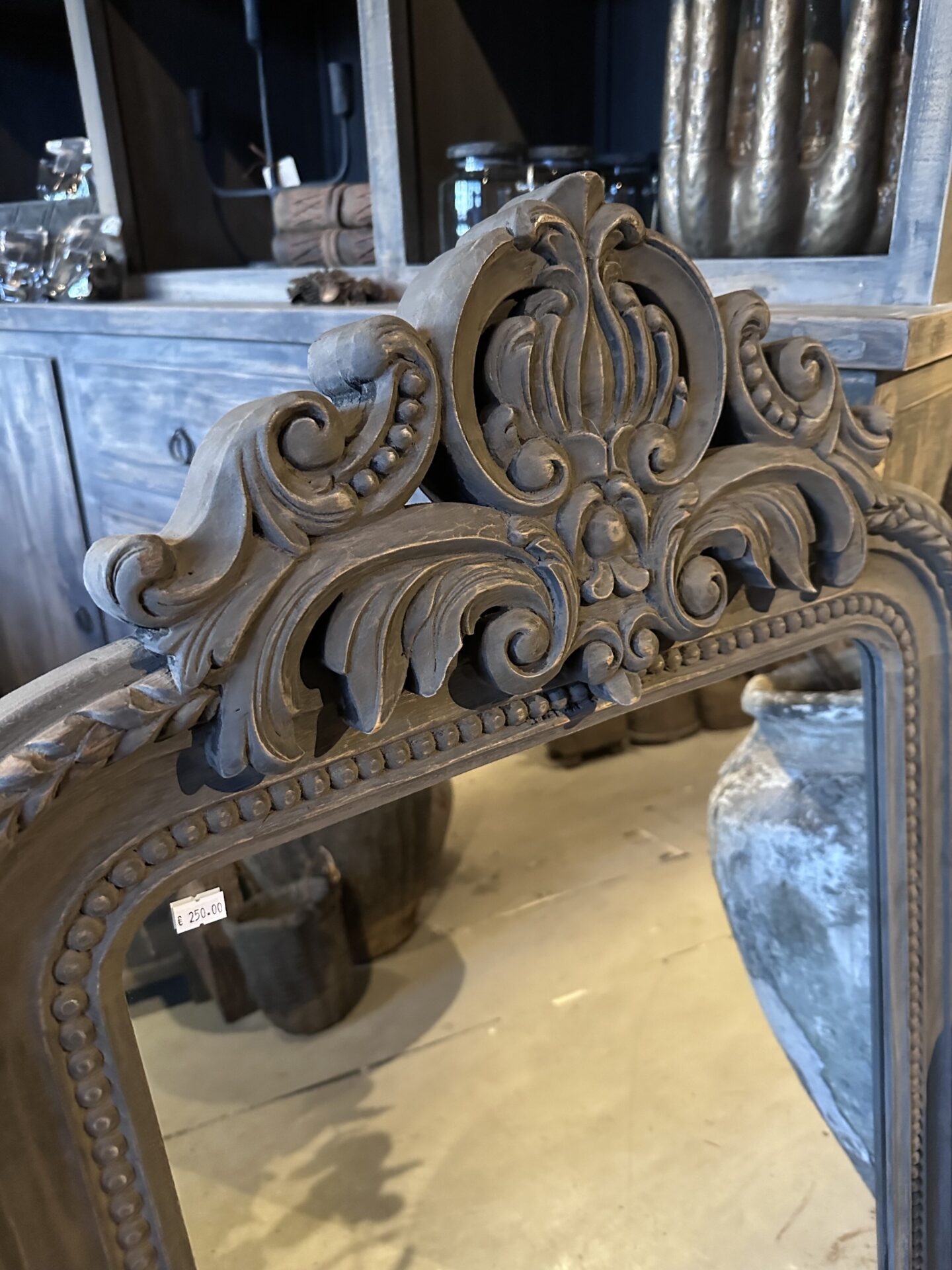 Barok Spiegel met Handgesneden Houtsnijwerk – Antiek Grijs – 71×100 cm