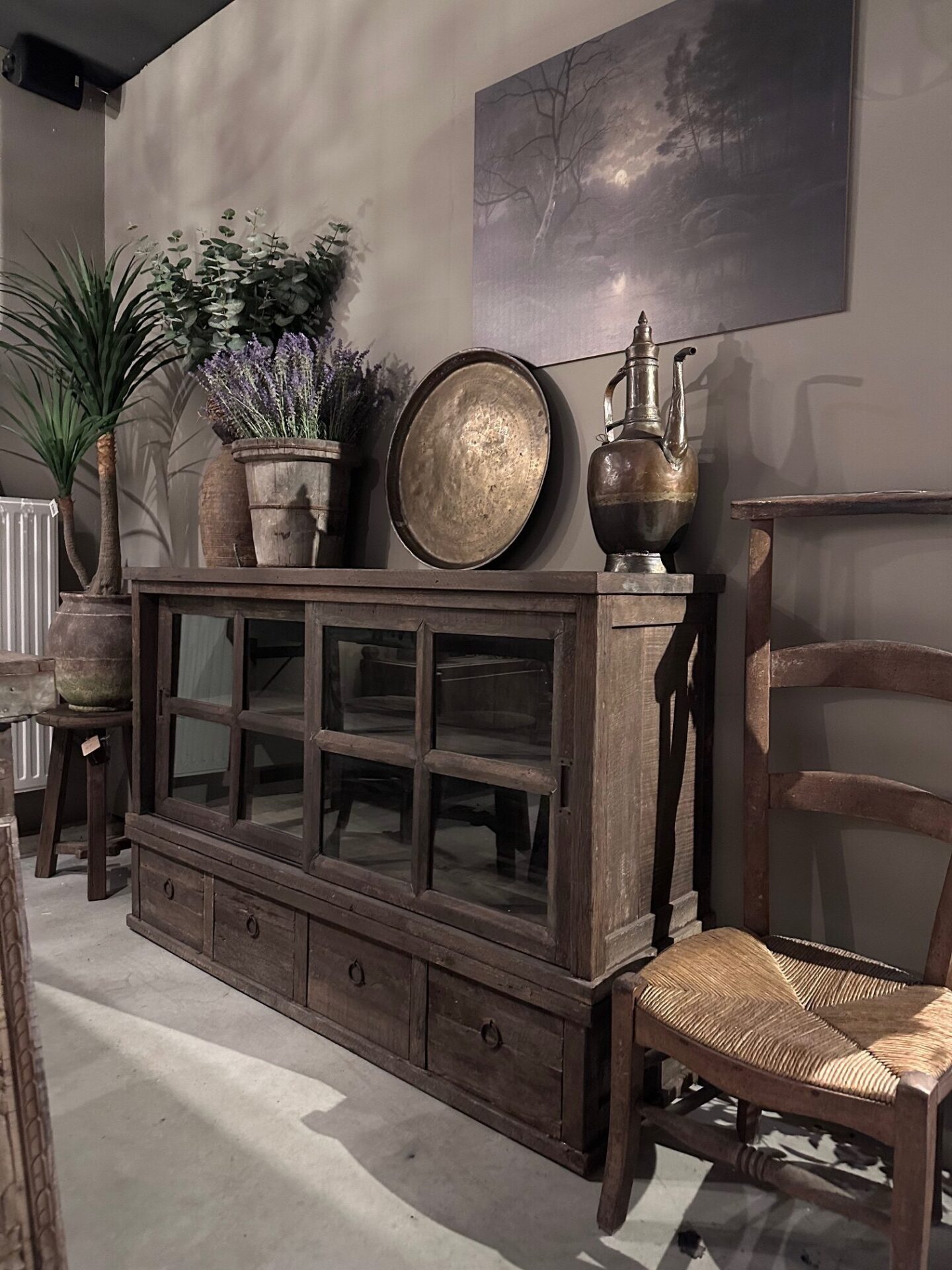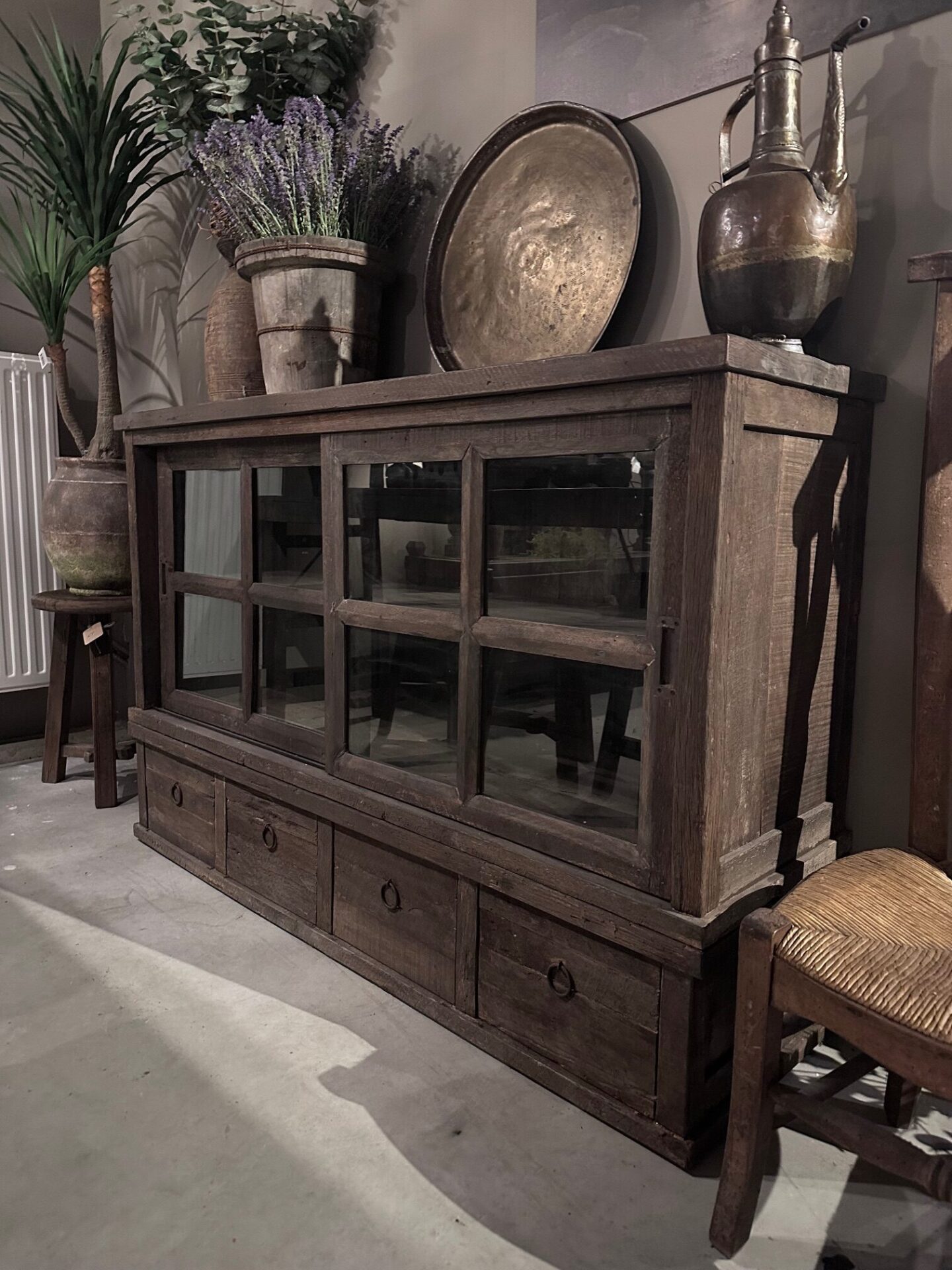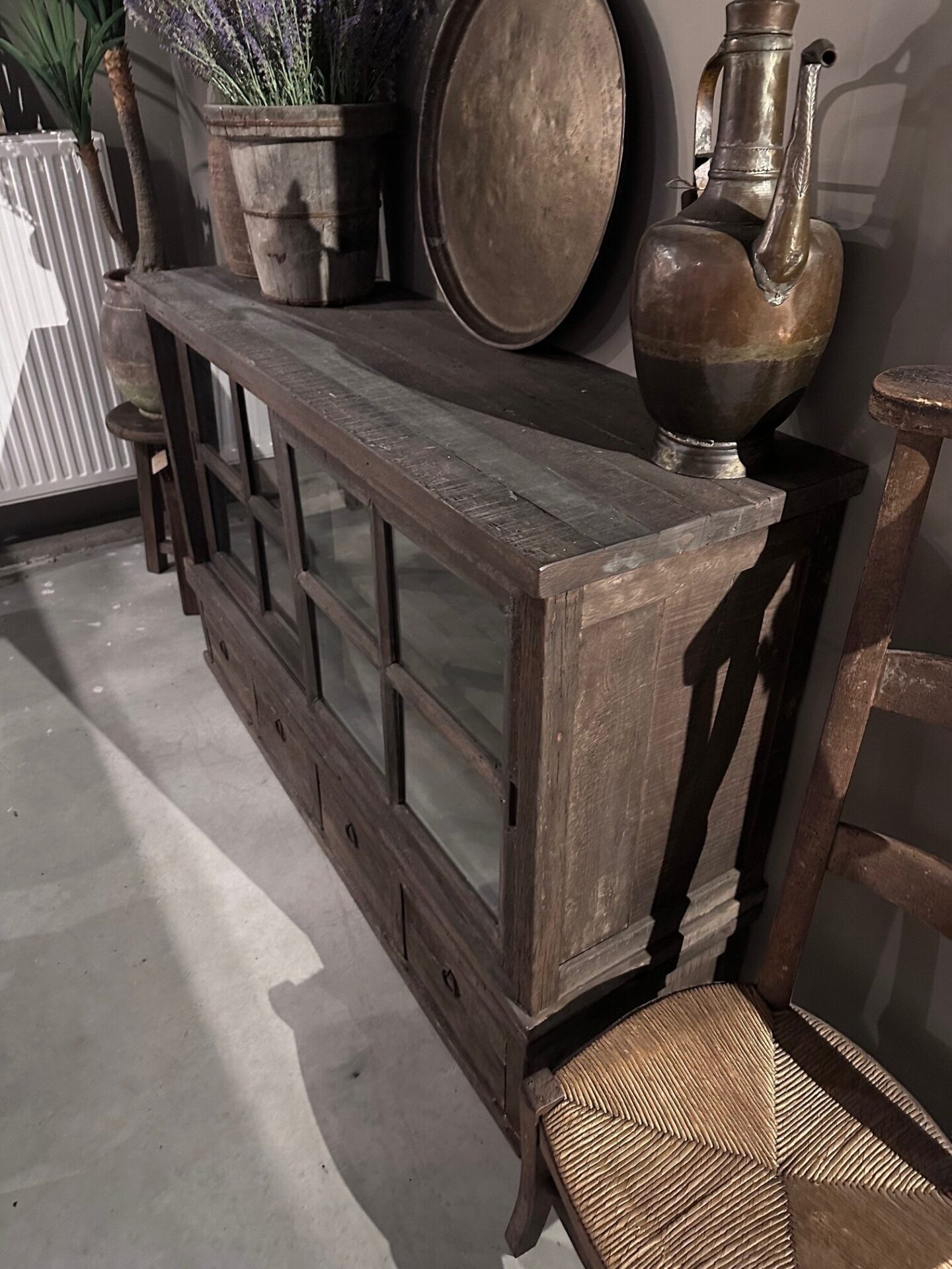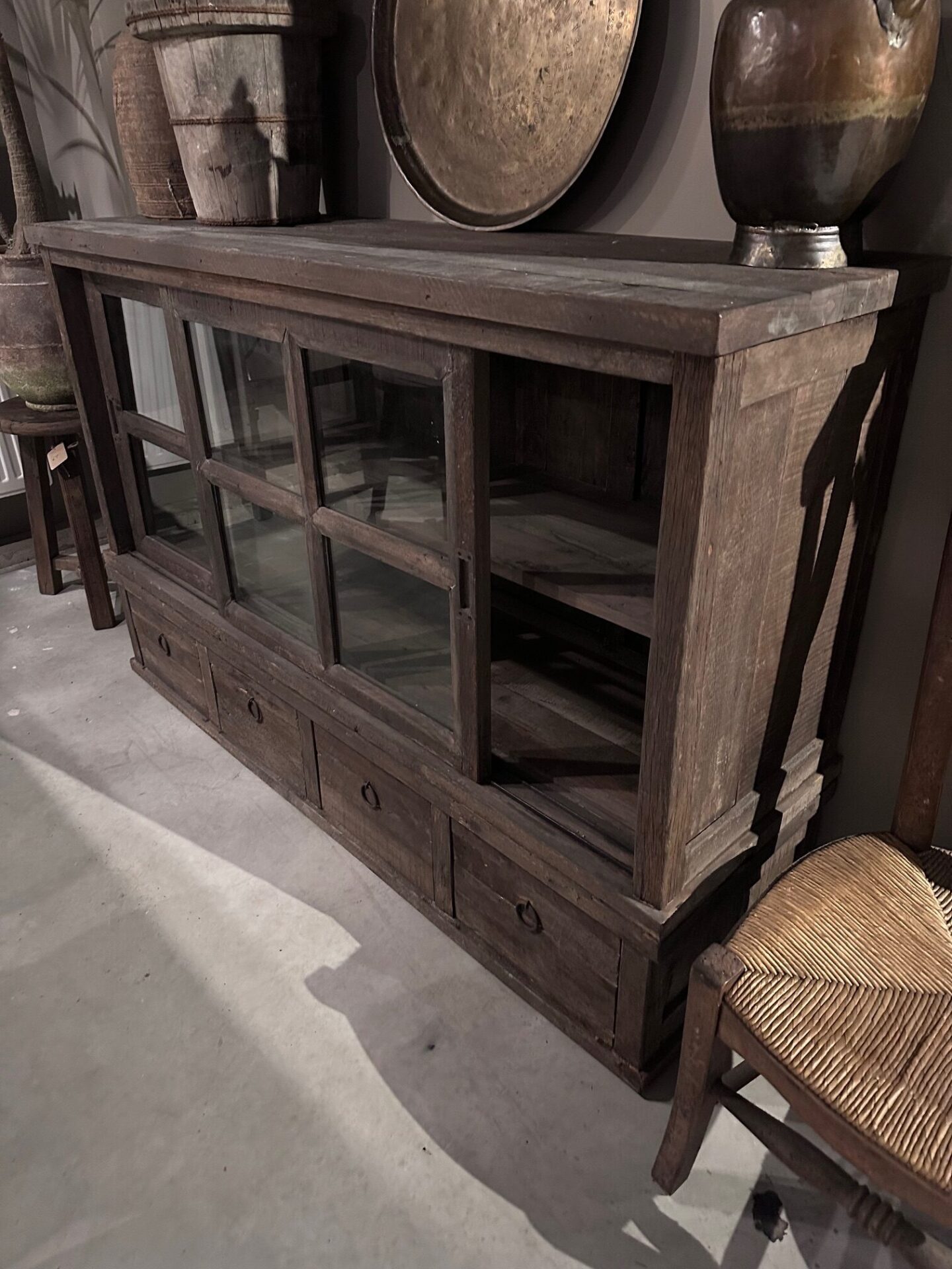 Driftwood dressoir met 4 lades en 2 vitrine schuifdeuren