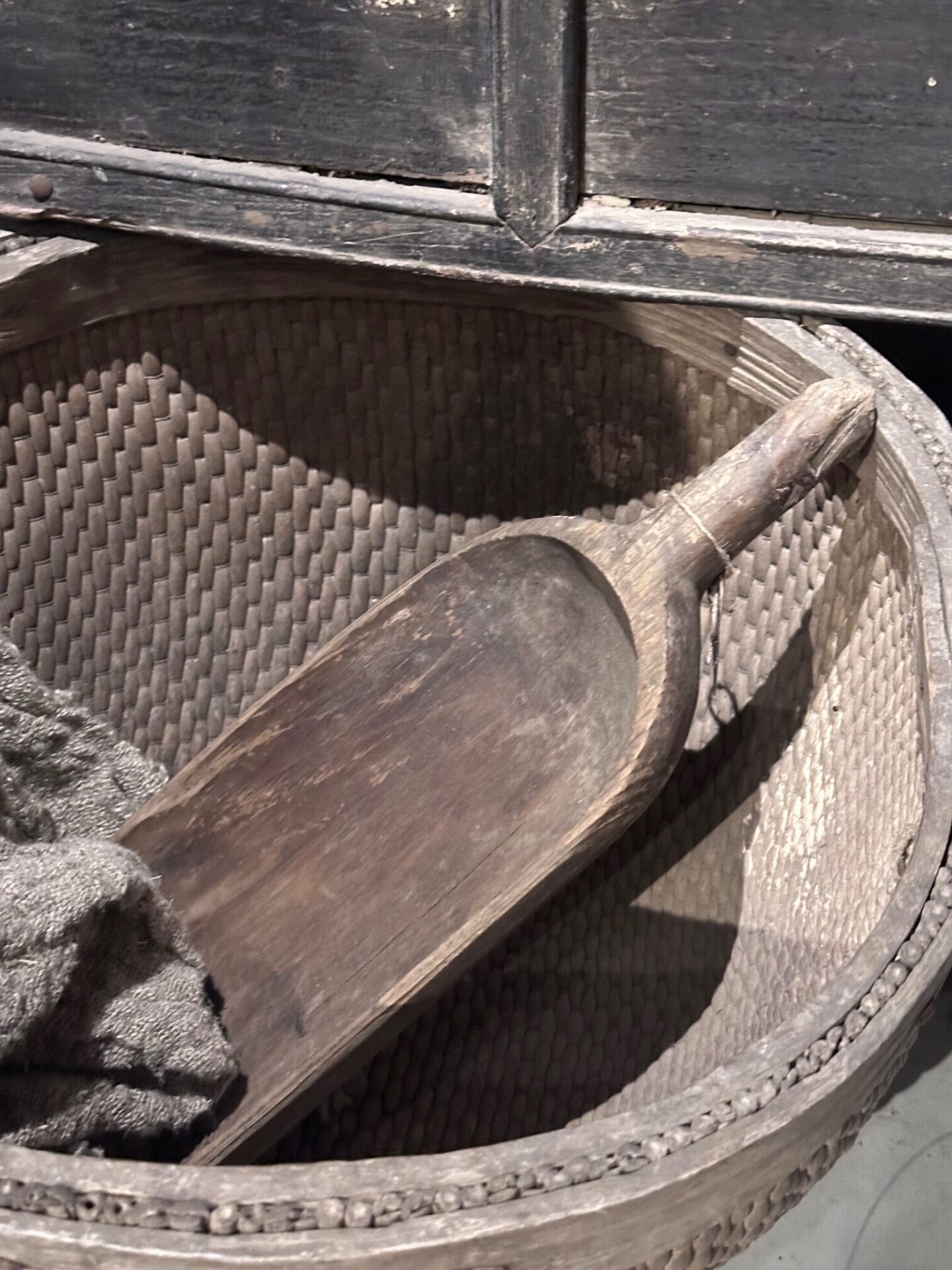 De schep is vervaardigd uit een enkel stuk lokaal hardhout, gekozen om zijn duurzaamheid en weerstand tegen slijtage. Het diepe, komvormige blad is perfect ontworpen om grote hoeveelheden rijst, gierst of tarwe uit de gevlochten voorraadmand (de dǒu) te scheppen. De ergonomische handgreep en de gladde afwerking – ontstaan door jarenlang intensief gebruik – vertellen het verhaal van dagelijkse arbeid en de cruciale rol die graan speelde in de Chinese samenleving als symbool van welvaart en overleving.