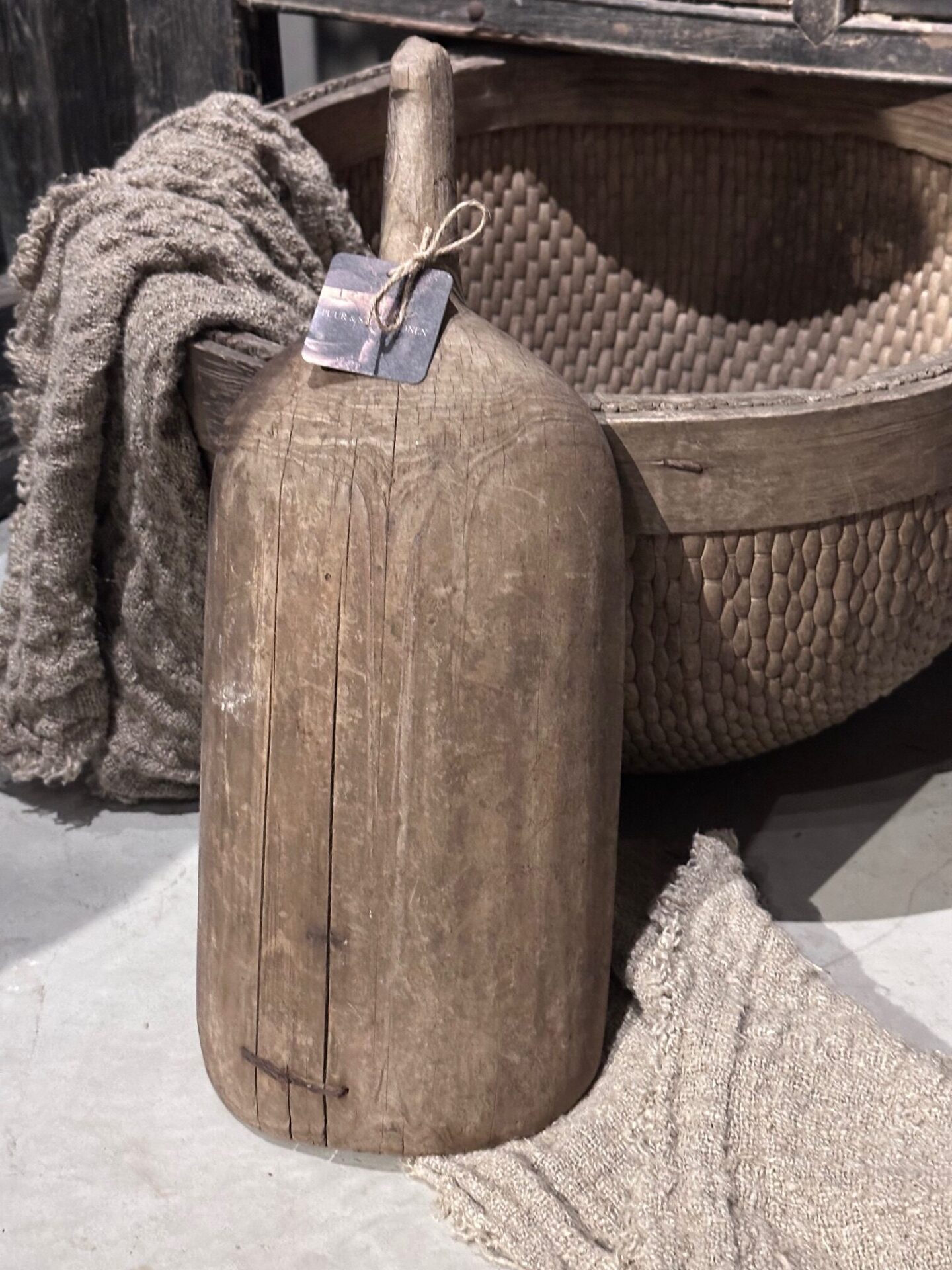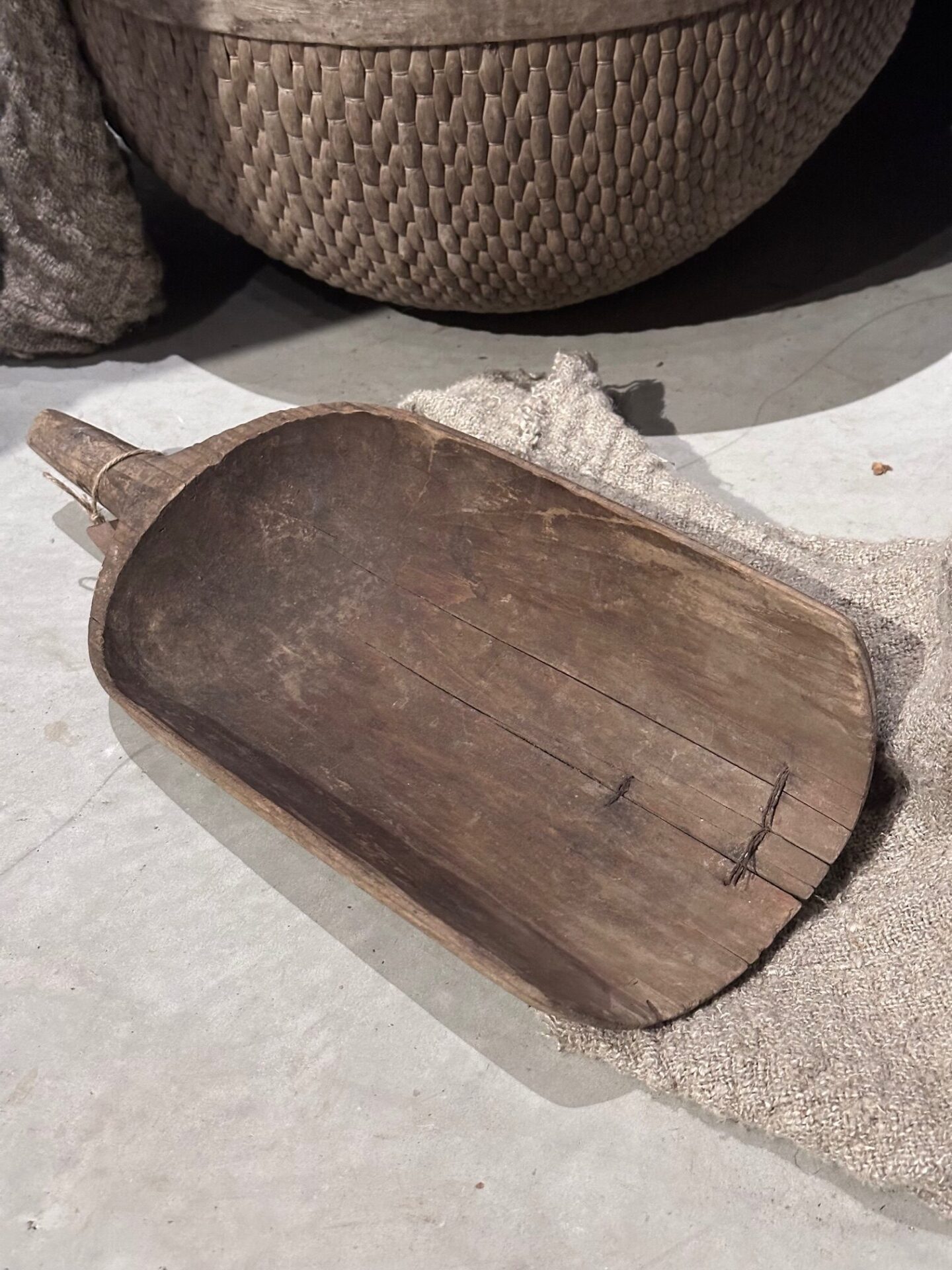 In de uitgestrekte landbouwgebieden van het historische China was deze oude handgesneden Chinese houten graanschep, ook wel een biànchǎn genoemd, een onmisbaar werktuig. Dit eenvoudige maar doeltreffende gereedschap weerspiegelt de eeuwenoude agrarische traditie waarbij elk onderdeel van de oogst met de hand werd verwerkt.