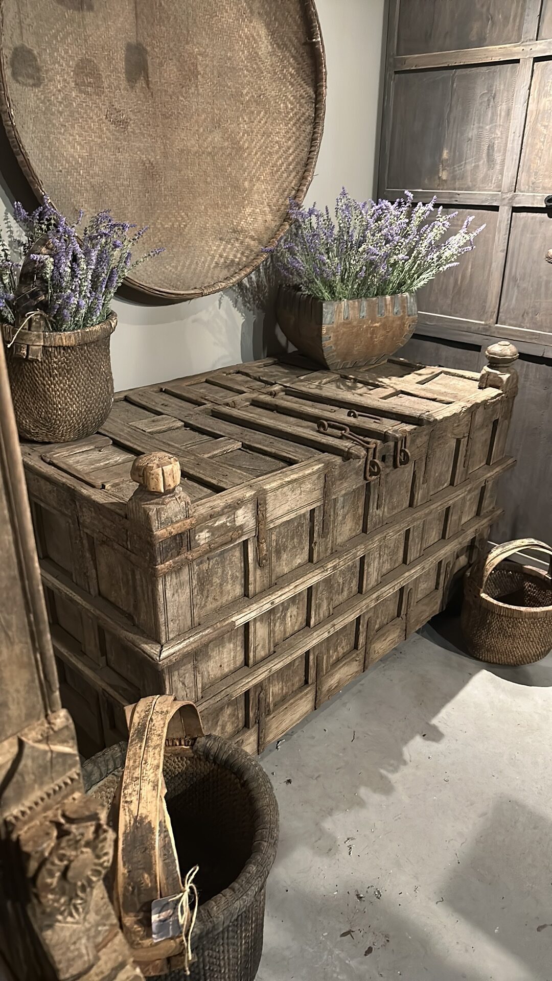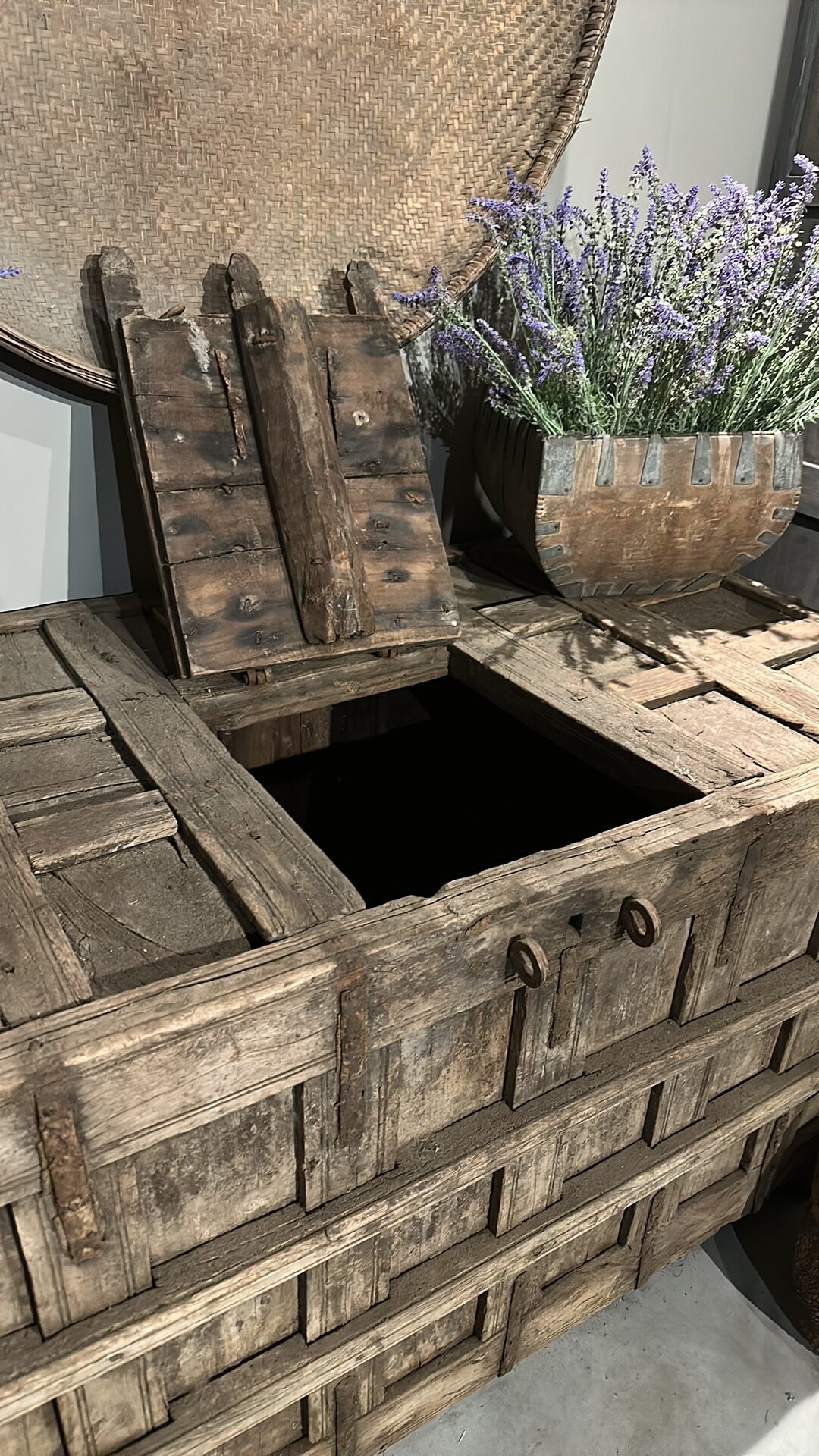 Deze indrukwekkende houten kist is een unieke verschijning met een prachtig doorleefd karakter. De kist is voorzien van schitterende authentieke details, zoals het zware ijzeren hang- en sluitwerk en de karakteristieke vakverdeling in het hout. Perfect te gebruiken als robuuste salontafel, sfeervol opbergmeubel of als decoratief pronkstuk in een landelijk, sober of Wabi-Sabi interieur.